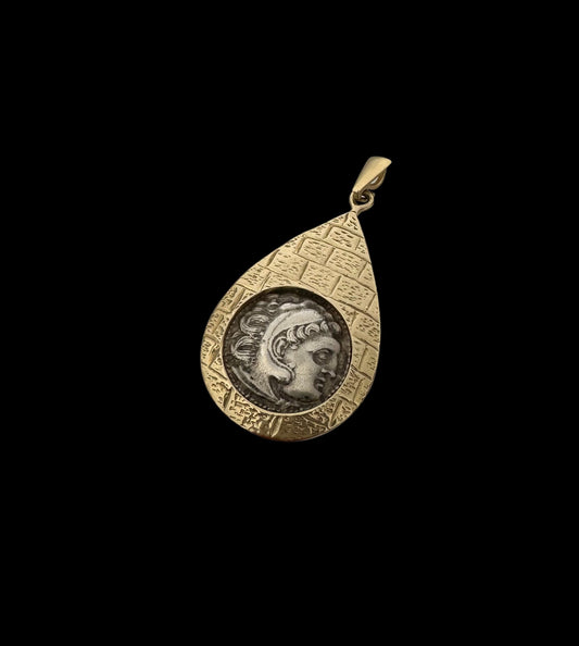 Ancient Alexander the Great Coin Set in 14K Gold Jerusalem City Walls Water Drop Pendant