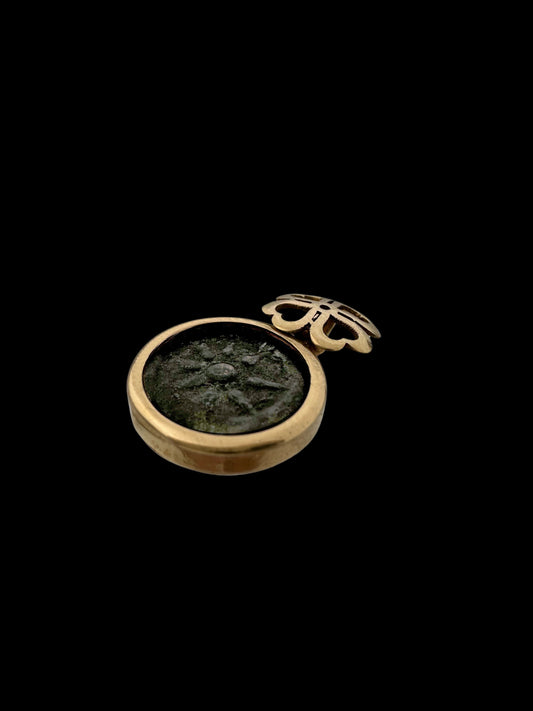 Ancient Widow’s Mite Jewish Hasmonean Coin Set in 14K Gold Pendant with Clover
