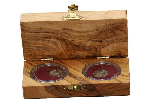 Ancient Bronze Widow’s Mite – Rare Double-Struck Coin from Jerusalem with Olive Wood Box